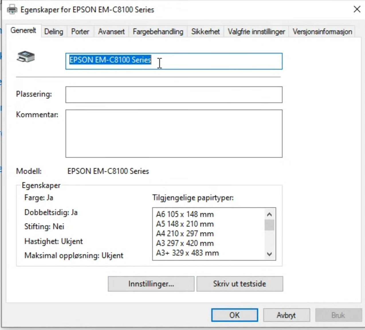 Klikk Skriveregenskaper. Under fanen Generelt, endre navnet til f.eks. «Epson C8100 A4». Klikk OK.