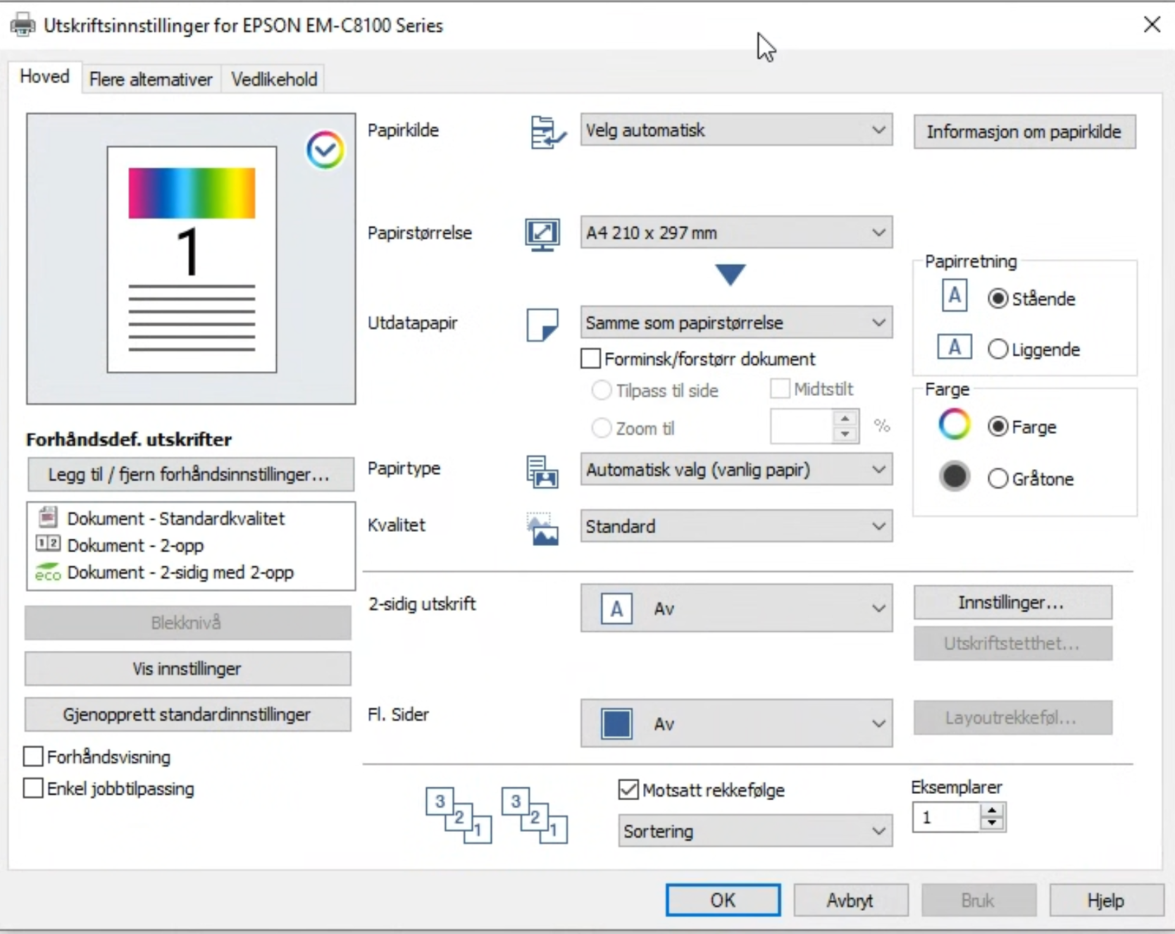 - Papirtype: Automatisk valg (vanlig papir)
