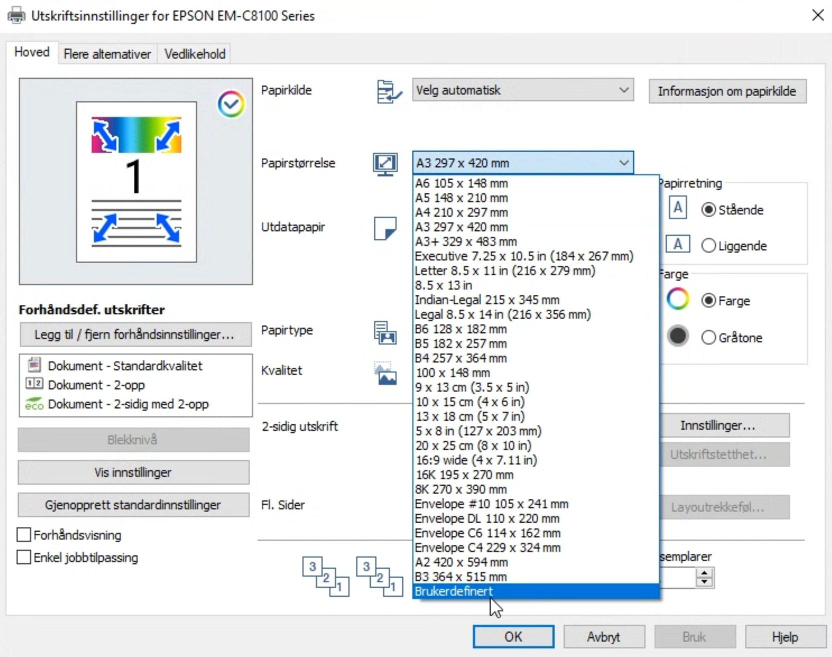 - I driverdialogen, klikk på nedtrekksmenyen Papirstørrelse