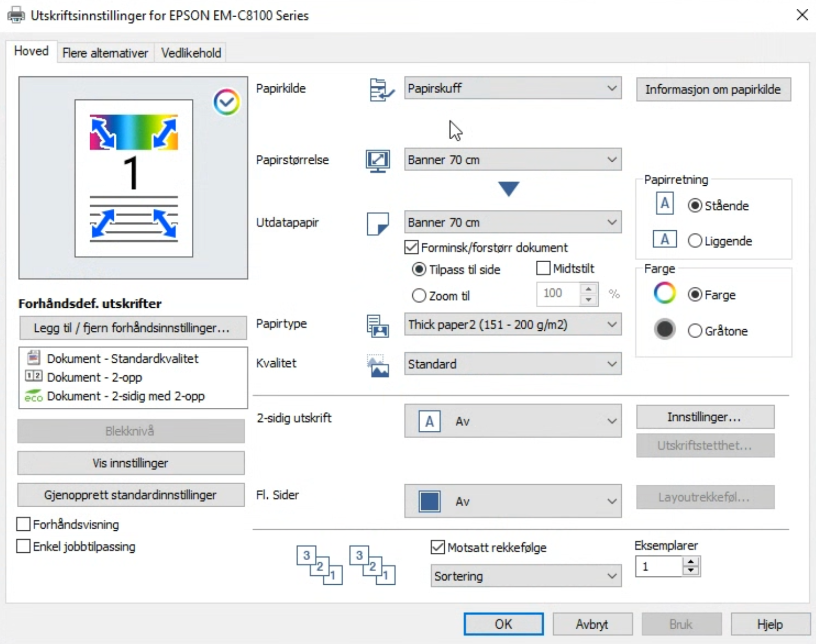 ⚠️ Papirtype for banner: For bannerpapir og tykkere medier, endre Papirtype fra «Automatisk valg (vanlig papir)» til riktig medietype. [KNUT: Sjekk hvilken Papirtype verdi som fungerer best for bannerpapir på C8100 — f.eks. «Tykt papir», «Matt papir» e.l. — og oppdater tabellen.]