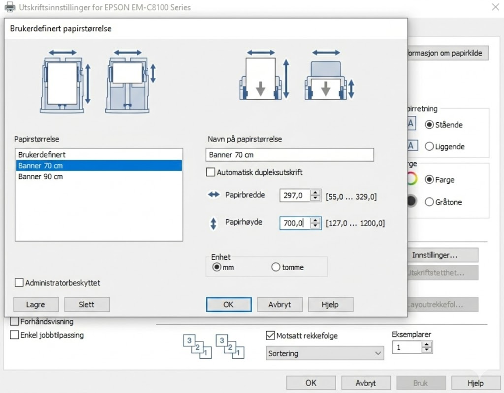 Hvis «297 × 700 mm» ikke finnes i listen over papirstørrelser: