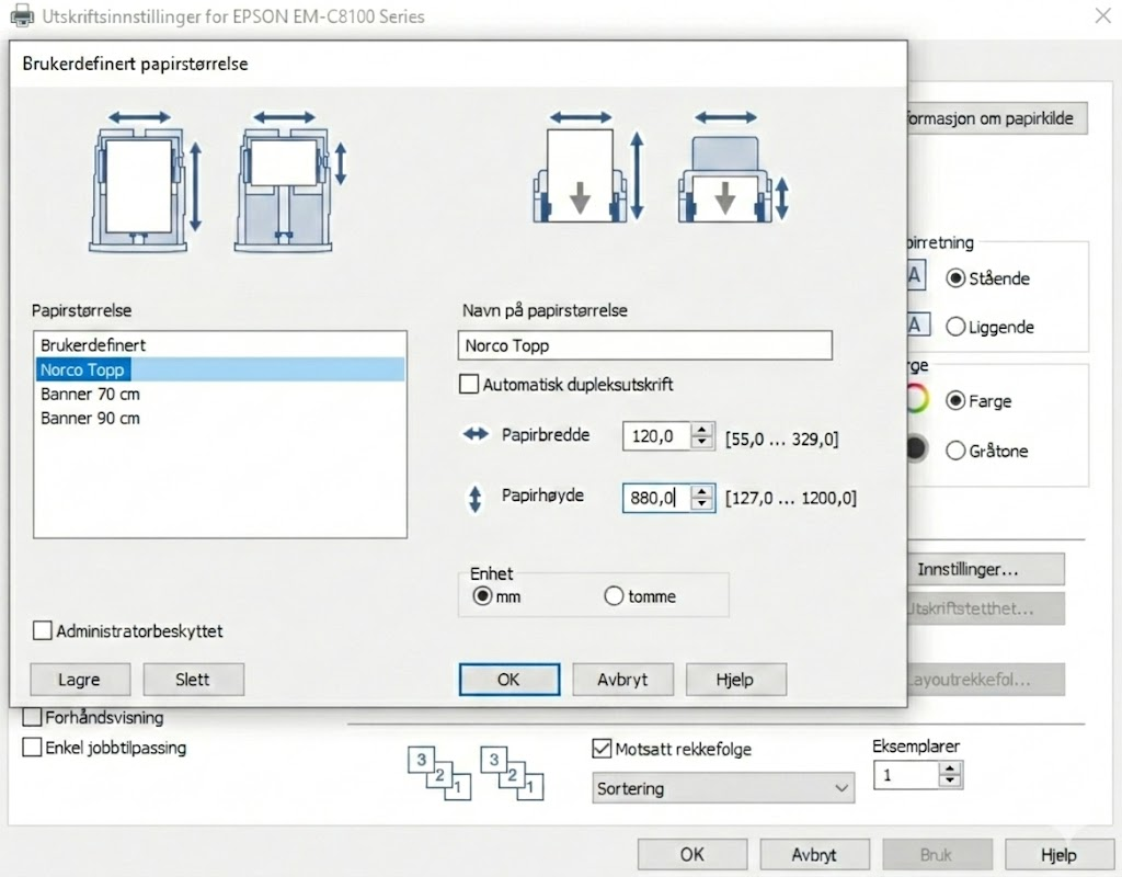 | Papirstørrelse | Egendefinert — 120 × 880 mm |